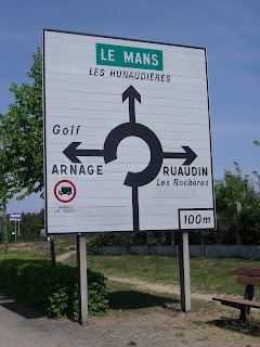 Antes de entrar em Le Mans, verifico a pressão dos pneus (máxima, para peso máximo), até parece que o fiz de propósito, mas não. Quando dou por mim, estou em pleno circuito. As curvas têm aquelas delimitações coloridas e recortadas, 4 rails de protecção de altura, entre outro tipo de acessórios e informação. O mítico circuito de Le Mans, estende-se às estradas limítrofes ao circuito privado.